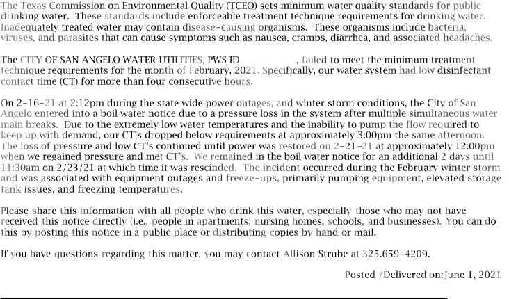 In 1996, Congress amended the Safe Drinking Water Act to include a requirement that water utilities annually notify customers about their drinking water quality. This report is produced annually by the Department of Water Utilities to provide information about the San Angelo water system, source water, levels of minerals and any detected contaminants, and to ensure compliance with applicable TCEQ rules and regulations. We hope this report will also help answer any questions you may have about our water system and quality. The Department of Water Utilities is part of your city government. If you have questions about this report, you may contact us by telephone or mail: